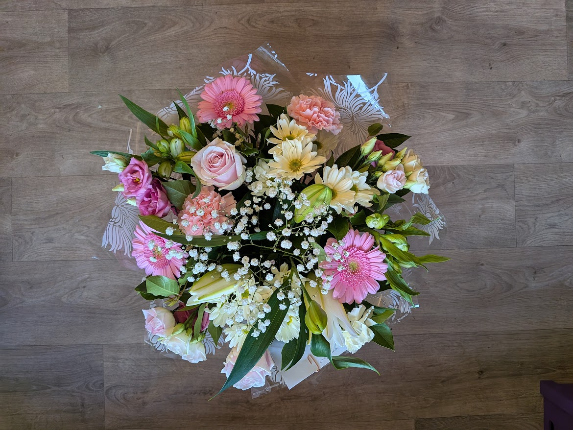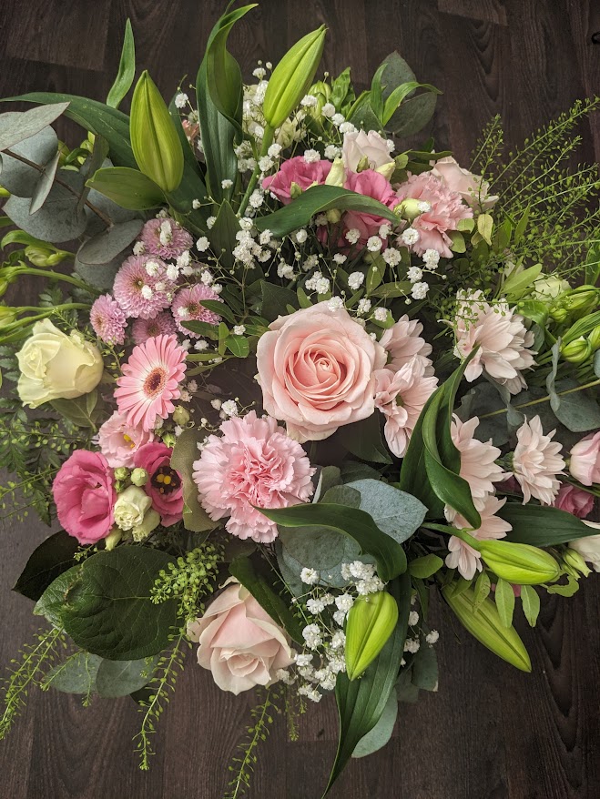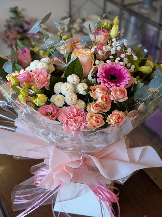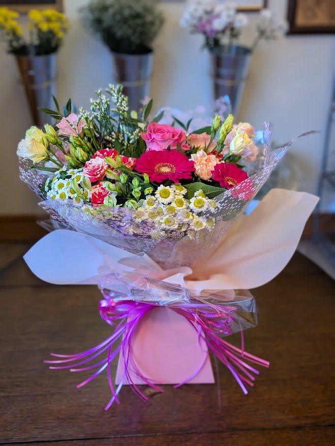 Hand tied bouquet arranged with a mixture of pink and cream seasonal flowers -prepared using the freshest flowers . This bouquet is perfect for any occasion and any reason. Your flowers will be hand chosen by our florist, the image shown is for illustration purposes only and may vary.
