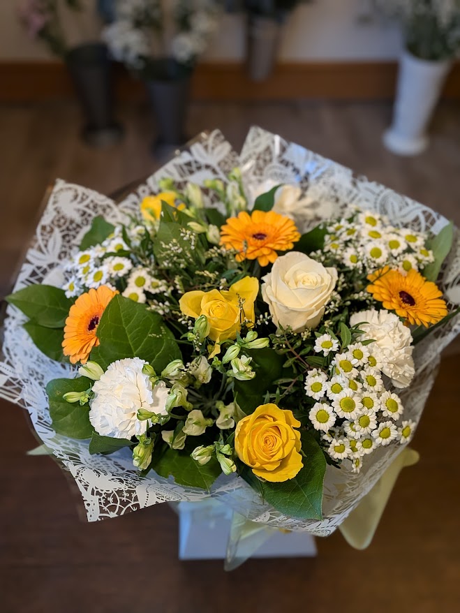 hand tied bouquet arranged with a mixture of yellow, green and cream seasonal flowers -prepared using the freshest flowers . This bouquet is perfect for any occasion and any reason. Your flowers will be hand chosen by our florist, the image shown is for illustration purposes only and may vary.